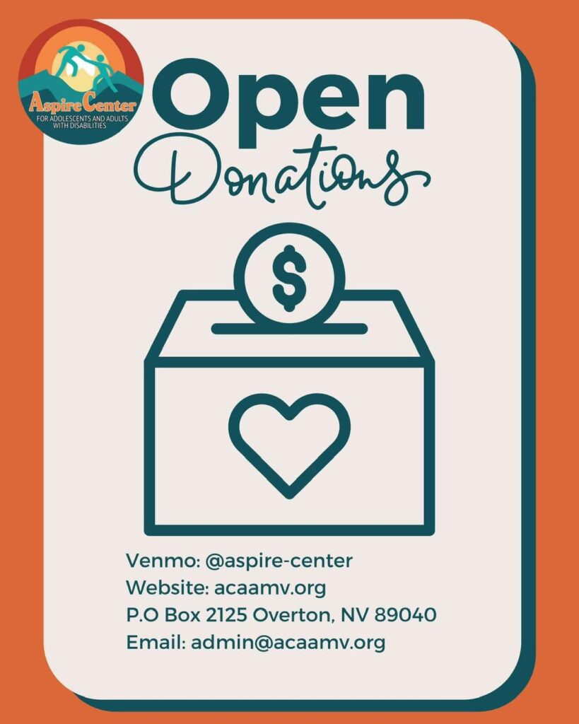 Donations by check can be made out to: “Aspire Center for Adolescents and Adults of Moapa Valley” and mailed to Aspire Center, P.O. Box 2125, Overton, NV 89040